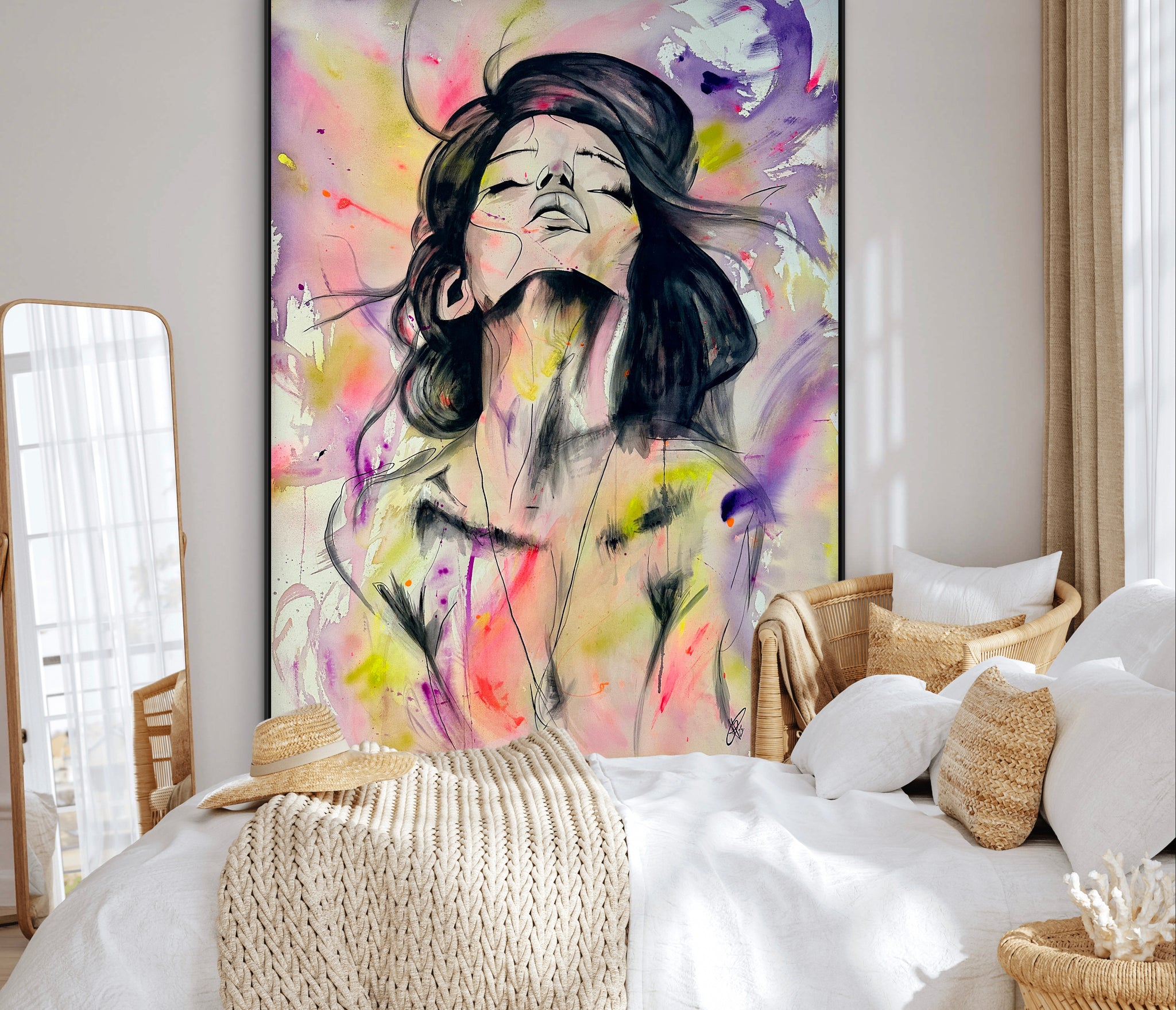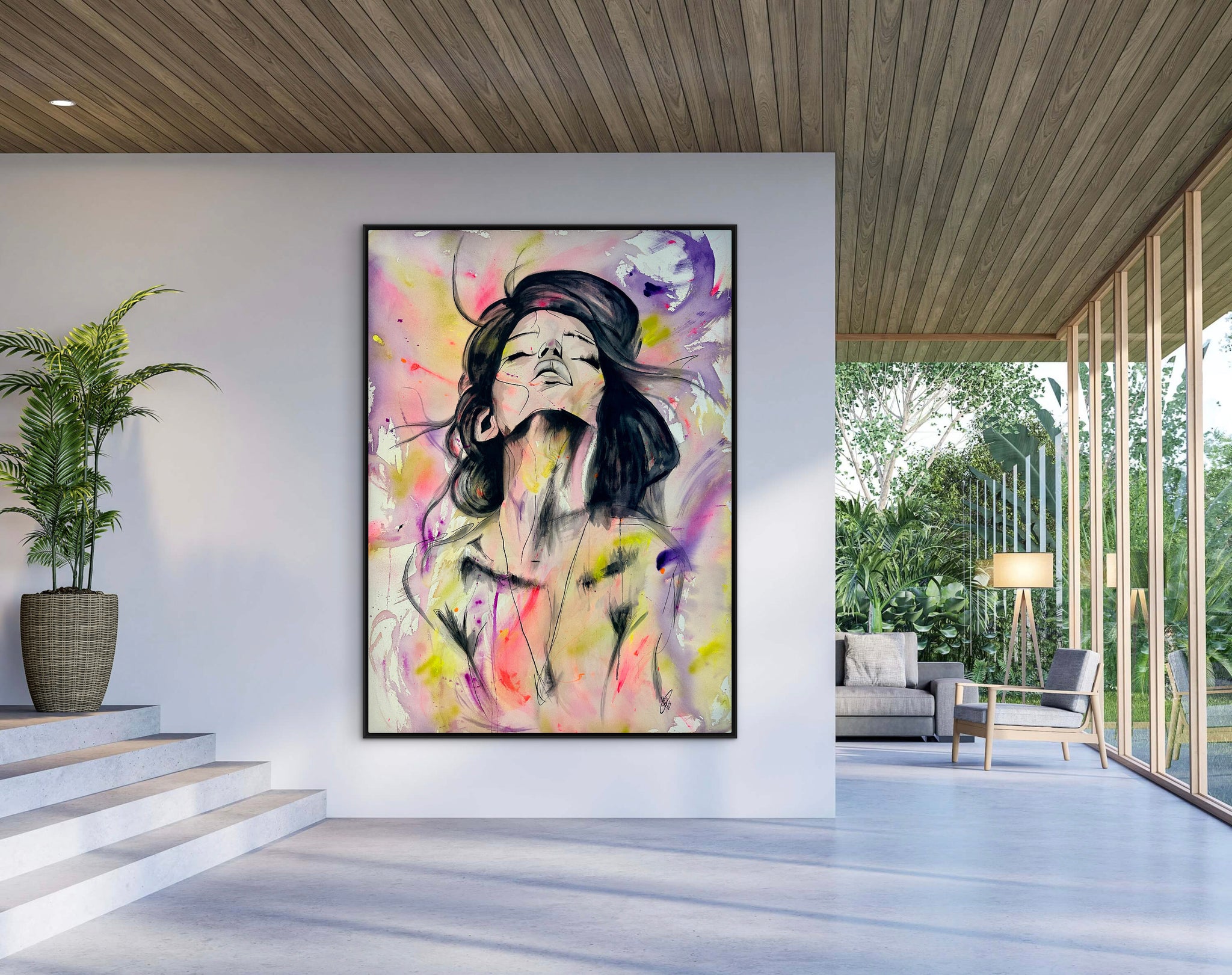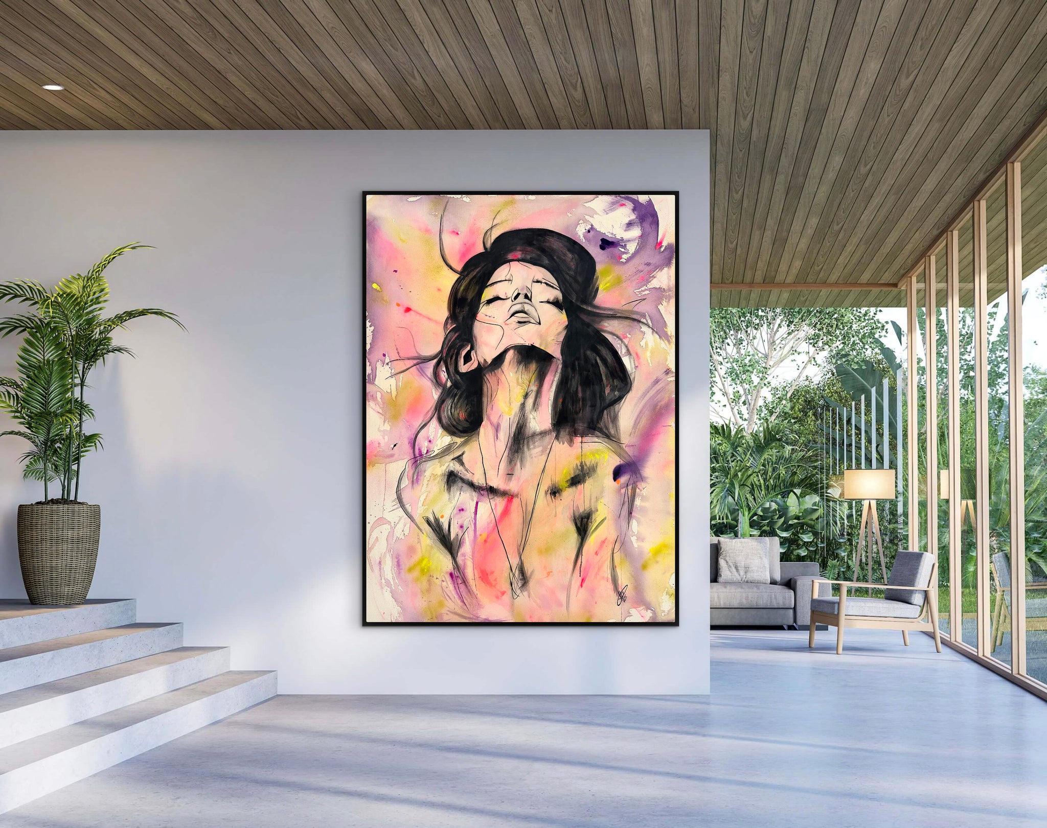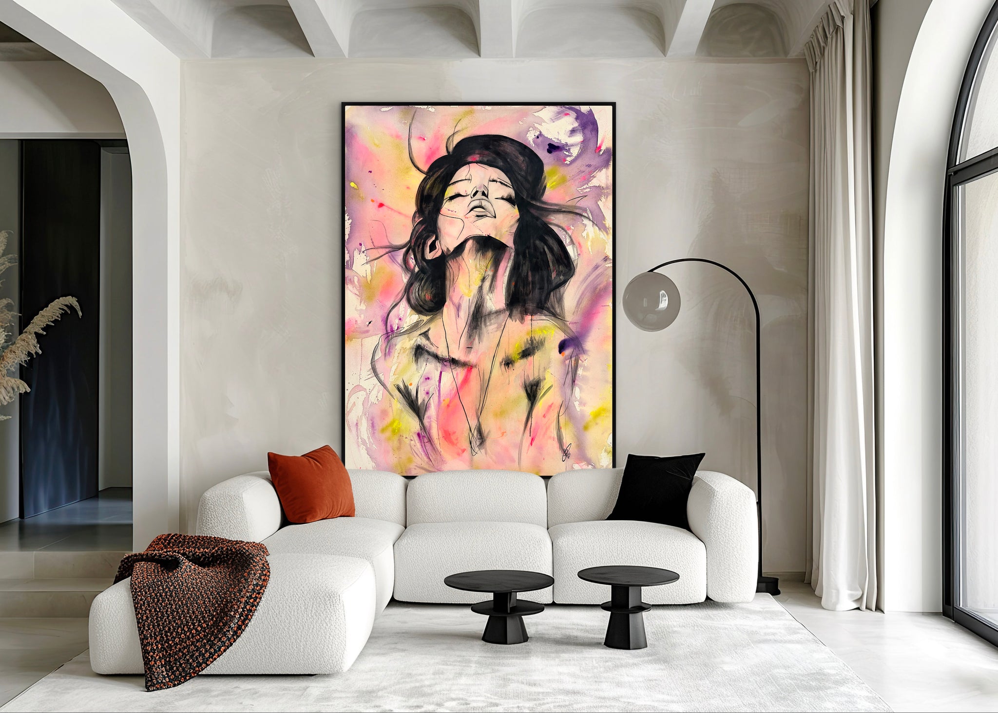 Created through organic layering and intuitive movement, Inhale combines fluid washes with expressive charcoal lines. The piece began as a loose gestural sketch, then evolved through translucent veils of pinks, yellows, violets, and skin-toned neutrals. Charcoal contours were added late in the process, allowing the figure to rise out of the abstract field like a memory surfacing from deep water.